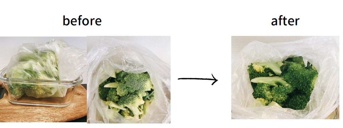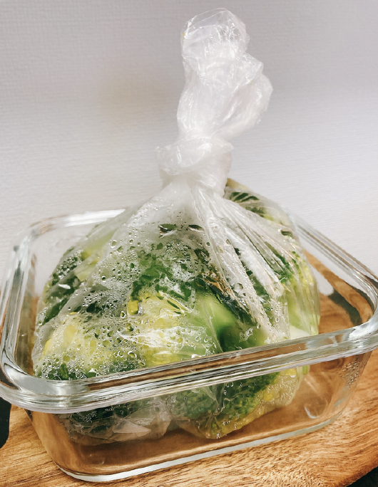 だから袋のラップ・アイラップなんですね。湯煎できるので、災害時のポリ袋調理にも。 ![]() 特性を生かして、レンジ調理しましょう! ブロッコリーをアイラップに入れて耐熱容器に入れ、レンジへ。袋の口は縛らないでください。爆発しちゃいます。 レンチン後は青々として美味しそう! ![]()