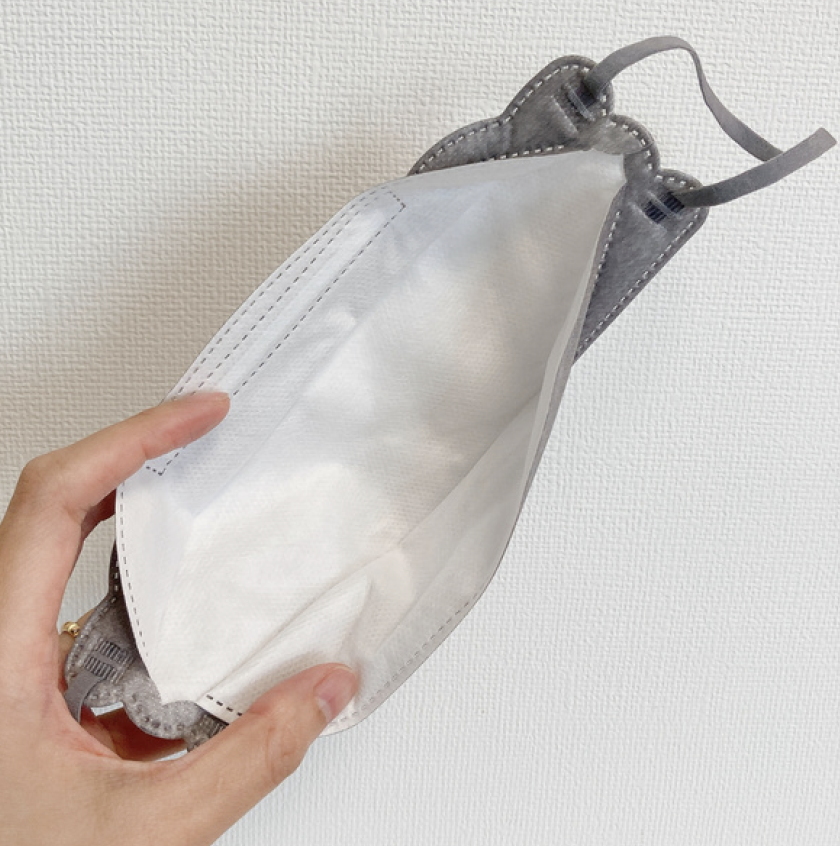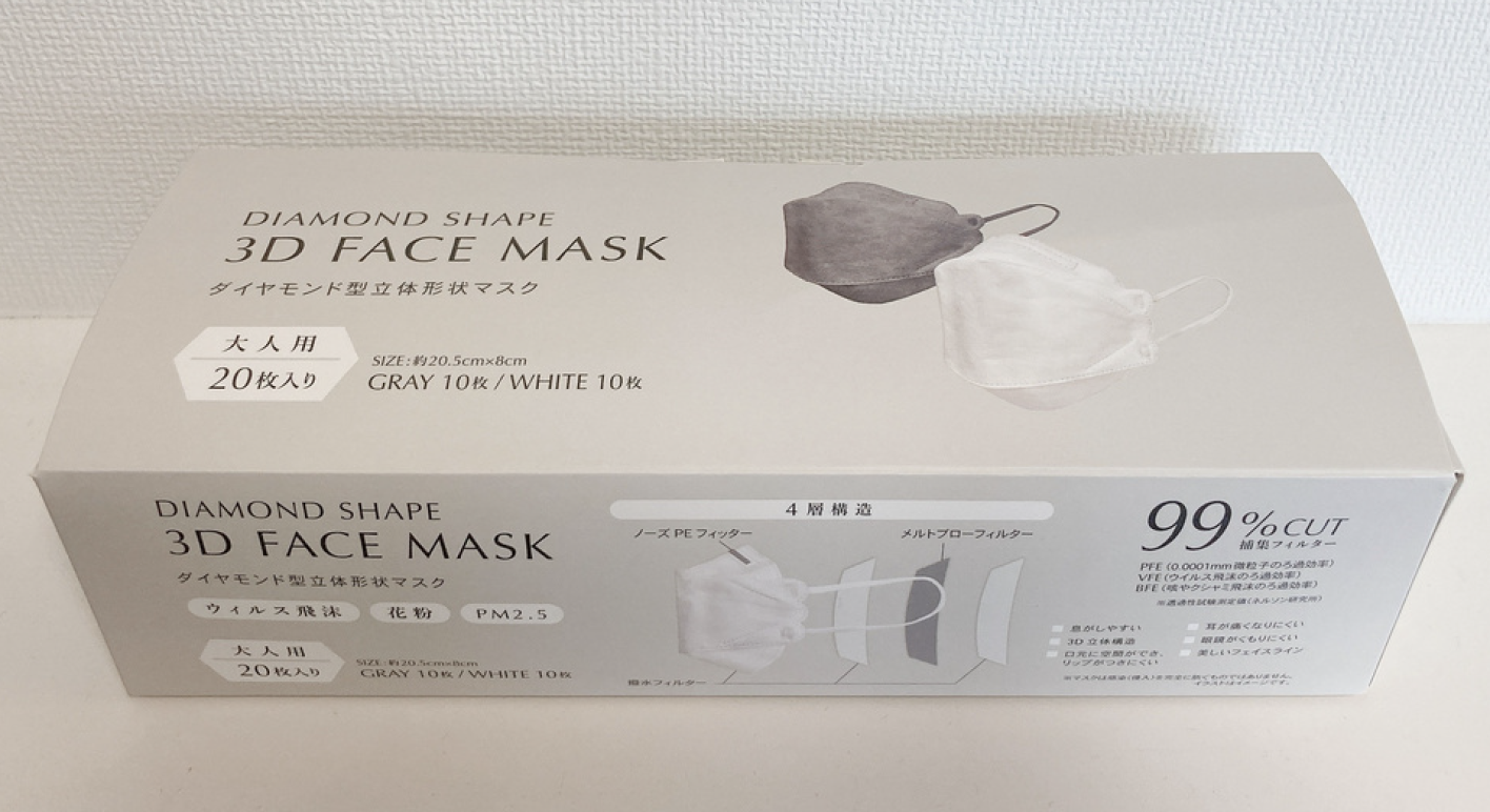 男女兼用のふつうサイズなので、横から見たら、女子には若干大きめ? ちょっと浮いちゃってますが、余裕がある分、優しい着け心地です。 ![]() 即完売する人気商品だそうです。見つけたら、買ってみてくださいね。 3coins ダイヤモンド型立体形状マスク 20枚 300円(税抜) ![]() ![]()