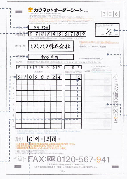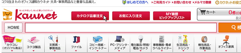 ≪ カタログを参照して注文する場合 ≫(1). [カタログ品番注文]ボタンをクリックし、商品番号と数量を入力します。(2). [商品名を表示する]ボタンをクリックして商品名を確認後、[カートへ]ボタンを押します。 ≪ 検索しながら商品を見つけたい場合 ≫Pat1. キーワードを入力し[検索]ボタンをクリックします。※商品名やメーカー名、商品番号等より検索します。 Pat2. カテゴリから欲しい商品を見つけます。 ≪ 定期的に購入している商品を注文する場合 ≫[MY履歴ピックアップリスト]をクリックし、過去の注文履歴から選びます。※注文時にお気に入り登録をしておくと、[お気に入り注文]をクリックすれば、その商品が表示されます。 STEP3. カートの商品を確認し注文手続きを行います(1). 右上の[カート]をクリックし、ご注文カートを表示させます。(2). 商品・数量・価格・お届け日を確認後、[ご注文手続きへ]ボタンをクリックします。 ※お届け日は次の画面で変更することが可能です STEP4. お客様情報を入力します(1). お客様情報を入力します(2). お届け日を変更する場合は、[お届け日変更]ボタンをクリックし、お届け希望日を入力します。 (3). [注文確認画面へ]ボタンをクリックします。 STEP5. 商品を注文する(1). お客様情報・商品等を確認します(2). [注文する]ボタンをクリックします。 (3). 注文完了画面が表示されれば、注文が完了です。 ※ご注文受付書はここで、印刷することが可能です。 ご注文のキャンセルについてご注文が完了すると直ちに出荷作業に入りますので、原則としてご注文のお取消しを行うことはできません。キャンセルしたい場合は、お手数ですが商品到着後に返品手続行ってください。 ご注意カウネットをご利用するの前に、必ず「カウネットご利用規約」をご覧ください。商品の価格や仕様は、途中で変更することがありますのでご了承ください。 サイト内のメンテナンスを行うため、毎日午前3:30~4:00頃までご利用いただくことができません。 お客様にはご迷惑をお掛けしますが、何卒ご理解を賜りますようよろしくお願い致します。 FAXでのご注文方法