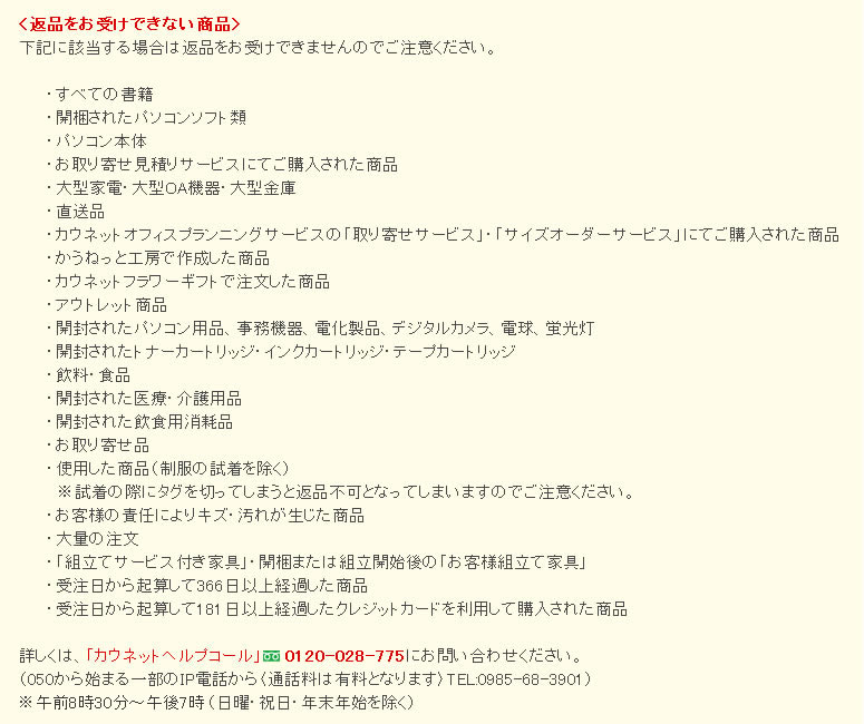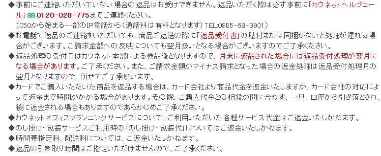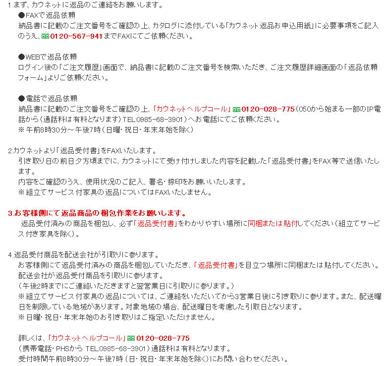 ≪ カウネット ≫ 返品・交換について返品・交換について![]() 商品のご返品について【返品方法(商品到着後からのお手続き)】![]() ![]() ご返品についてのご注意![]() 【家電リサイクル法に基づくリサイクル回収について】 ![]() 商品の交換について![]() 商品のキャンセルについて![]() 不足・未着商品について![]()