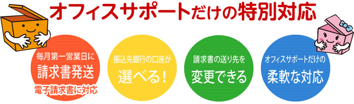 オフィスサポートだけの特別対応オフィスサポートが選ばれる理由![]() Point1 請求書が早い!オフィスサポートなら、毎月第一営業日に請求書発送 を確約!電子請求書の場合は、即日ご確認いただけます。 Point2 振込先銀行の口座が選べる!オフィスサポートなら、主要な5つの銀行からお選びいただけます。三菱UFJ銀行 ・ みずほ銀行 ・ 三井住友銀行 ・ りそな銀行 ・ 千葉銀行 いつもの銀行の利用で振込手数料の削減ができます。 Point3 請求書の送り先を変更できる!オフィスサポートなら、ご登録以外の請求書送付先もお電話1本でご指定 いただけます。